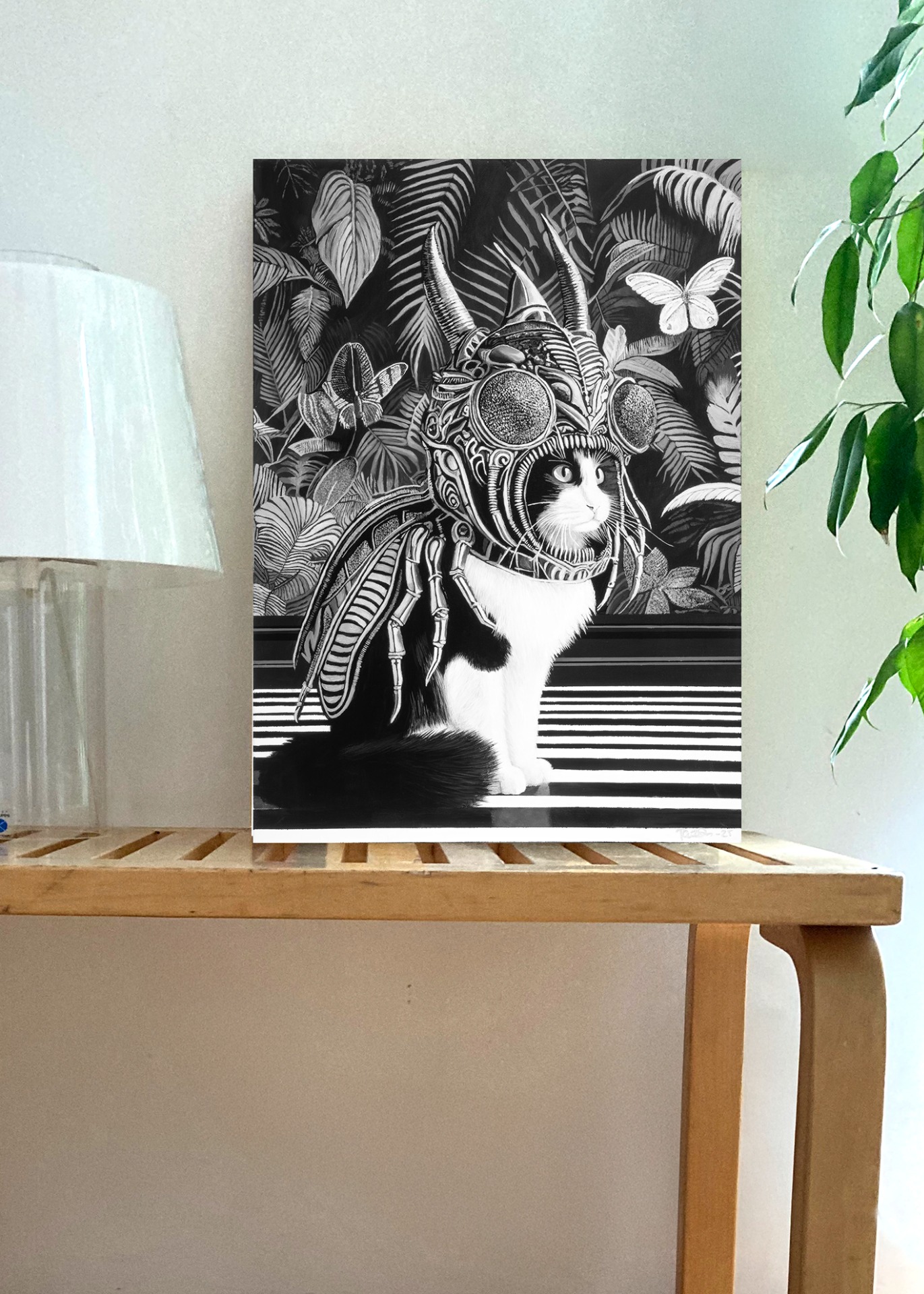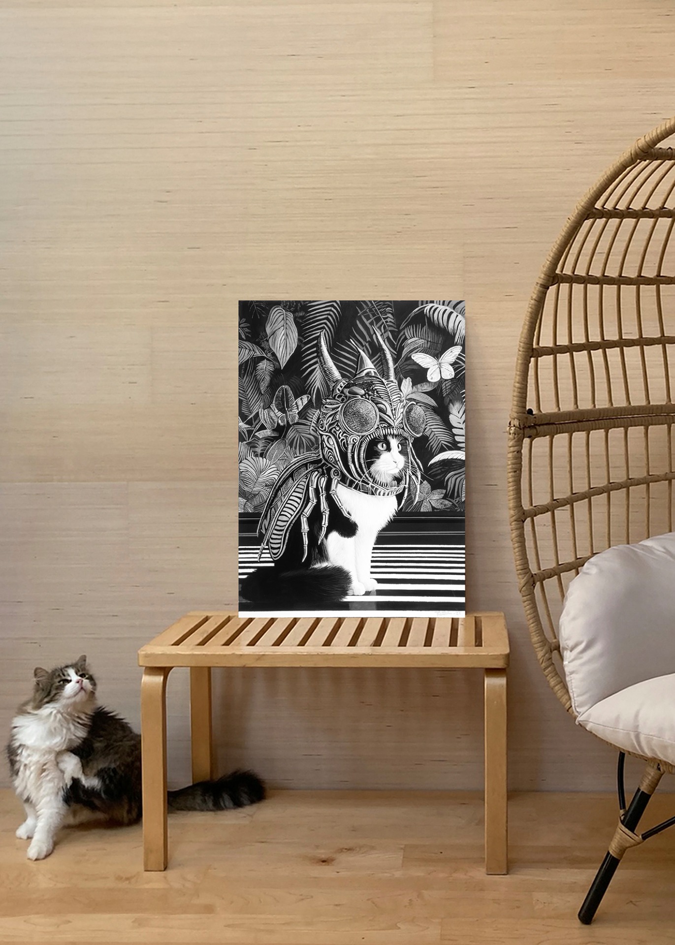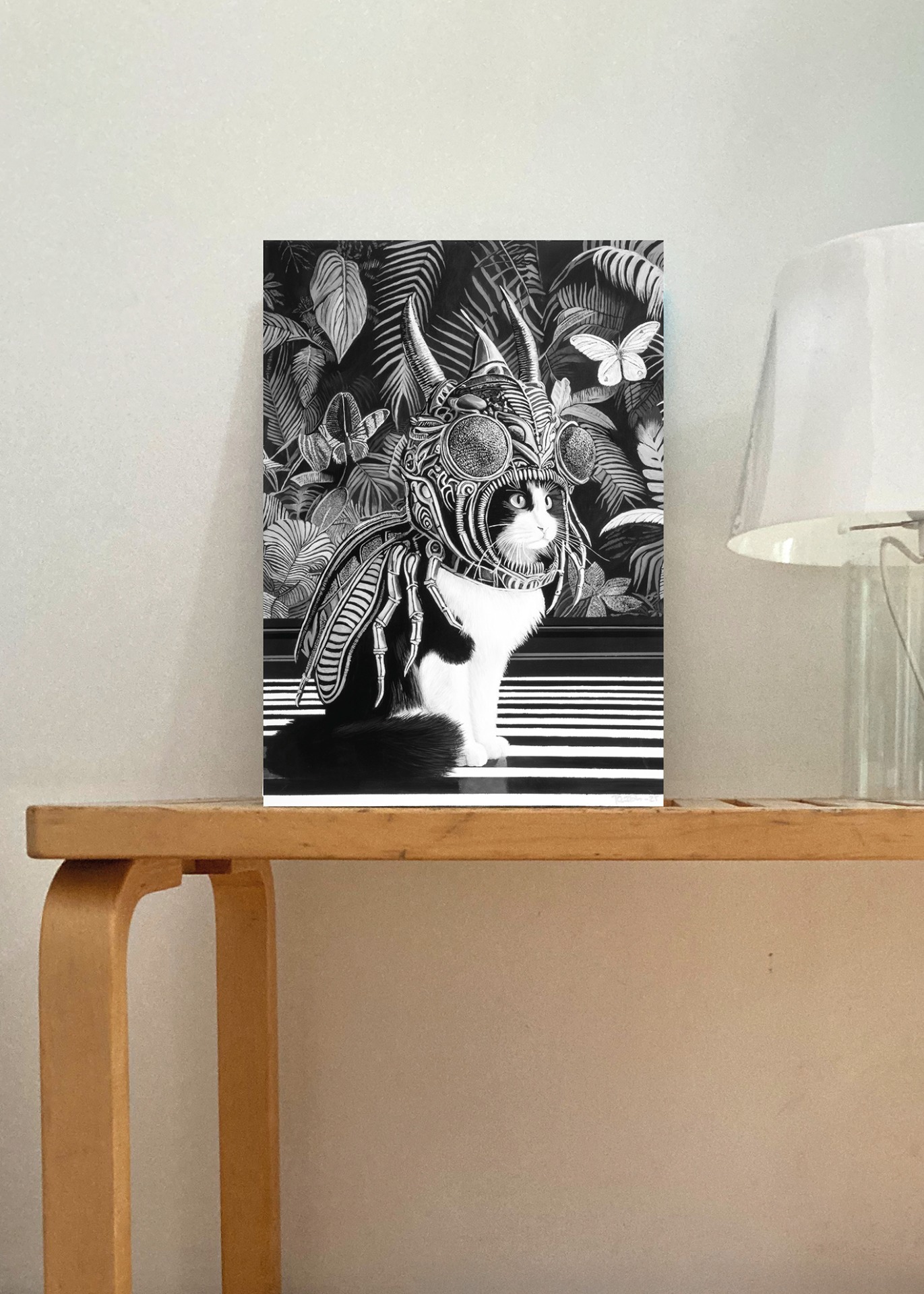 Persoonallinen canvastaulu, jossa mustavalkoinen kissahahmo kohtaa