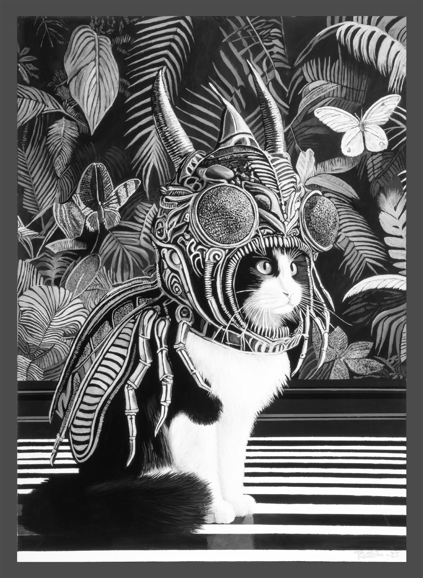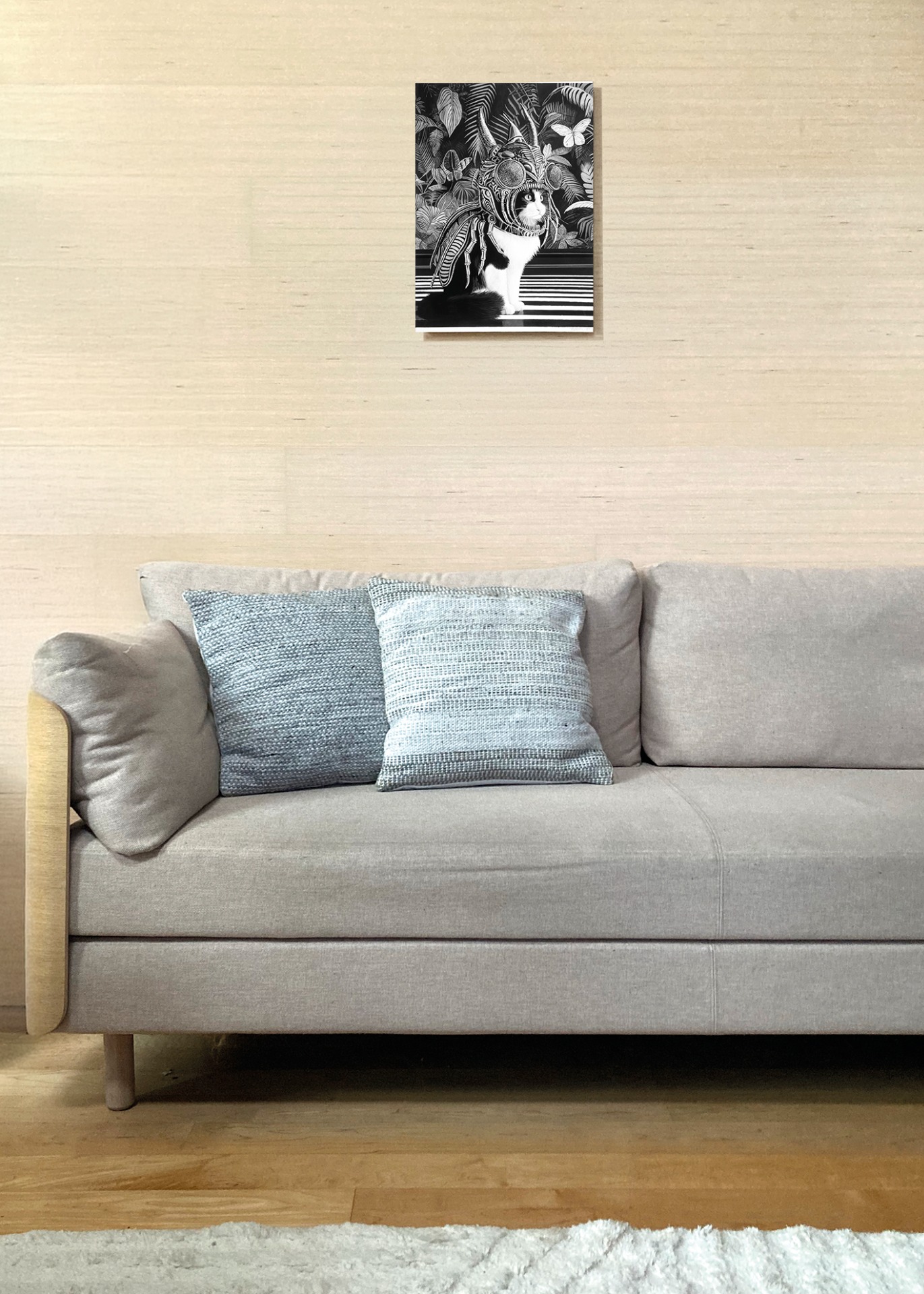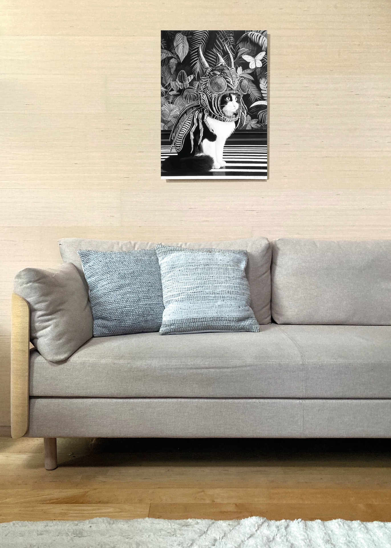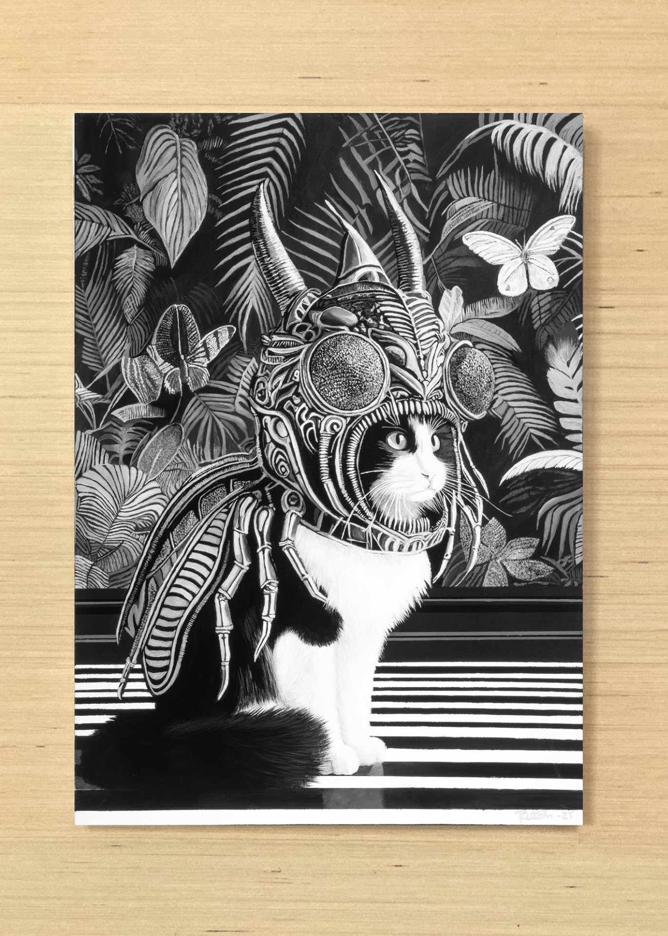 Persoonallinen canvastaulu, jossa mustavalkoinen kissahahmo kohtaa