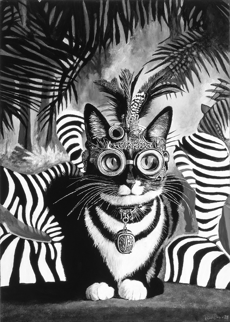 Seikkailullinen canvastaulu, jossa kissahahmo yhdistyy trooppisiin