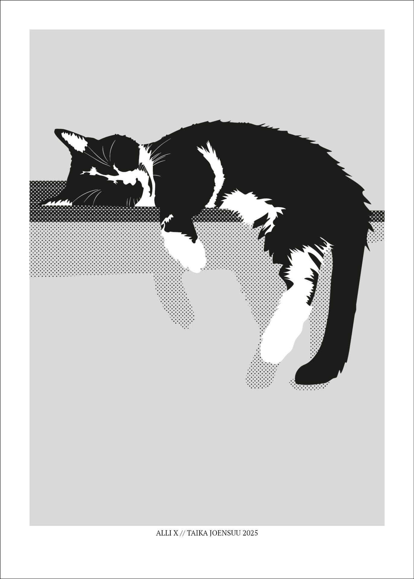 Rauhallinen ja pelkistetty kissajuliste, jossa pehmeä muoto ja rento